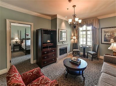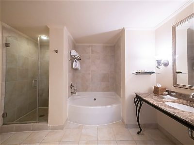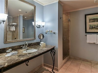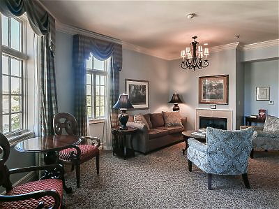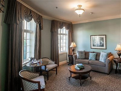 Our Junior Suite features a bedroom with king bed, spacious sitting area with desk and dining area for two, plus a spacious bathroom with garden tub and separate shower. The suite has a Mississippi River view.