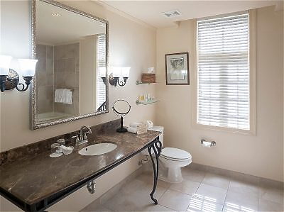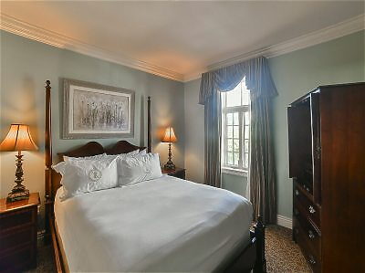 This expansive suite includes a bedroom with queen bed, elegant large sitting room with desk and dining area for two, plus a spacious bathroom featuring garden tub and separate shower. The Grand Suite has a Mississippi River view from both rooms.